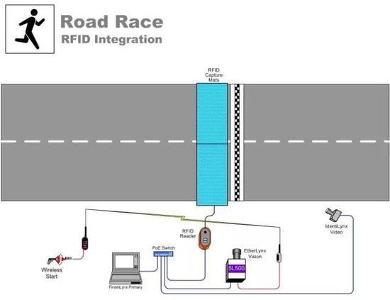射频识别计时RFID(Radio Frequency Identification)技术适用于长距离比赛的计时和记圈的系统,特别是成千上万名运动员参赛时,射频识别计时技术的优势十分明显。运动员携带不影响竞技状态的无源无线RFID感应器通过设置在起跑线上的射频识别天线阵列时,感应器向阅读器发出对应于每一个运动员的信息特征码,该运动员的信息特征码被数据处理系统处理并记录,实现自动计时和自动记圈的功能。