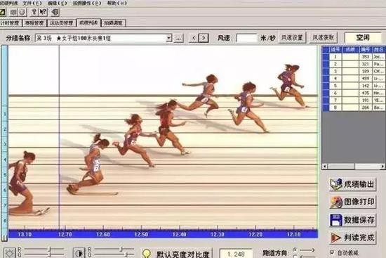 发令枪响,连接在发令台上的传感器同时启动高精度计时器,运动员接近终点线时, CCD高速数字摄像机以1ms/帧的速度连续拍摄运动员冲刺图像,经图像处理后存入计算机并叠加上时标,裁判通过移动鼠标来判读每个运动员的成绩,计算机自动排名并生成分组成绩表,输送至比赛大屏幕显示器。