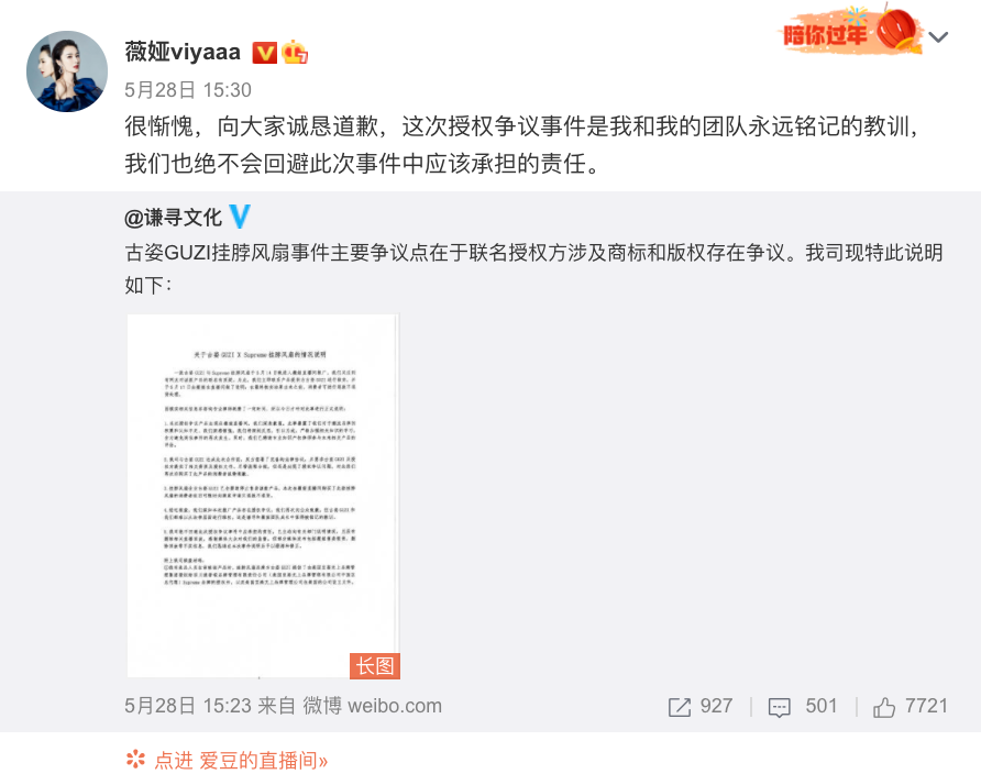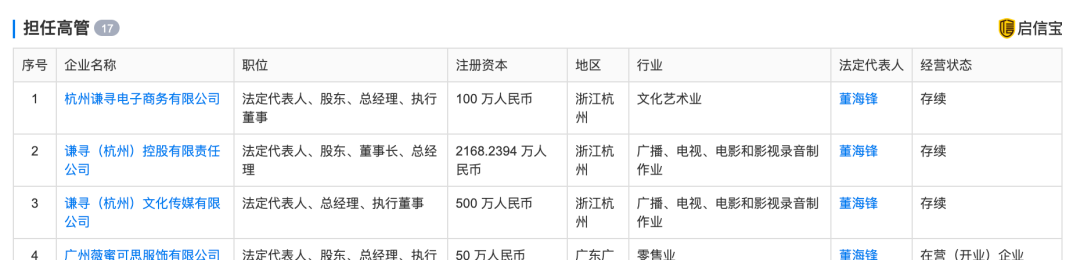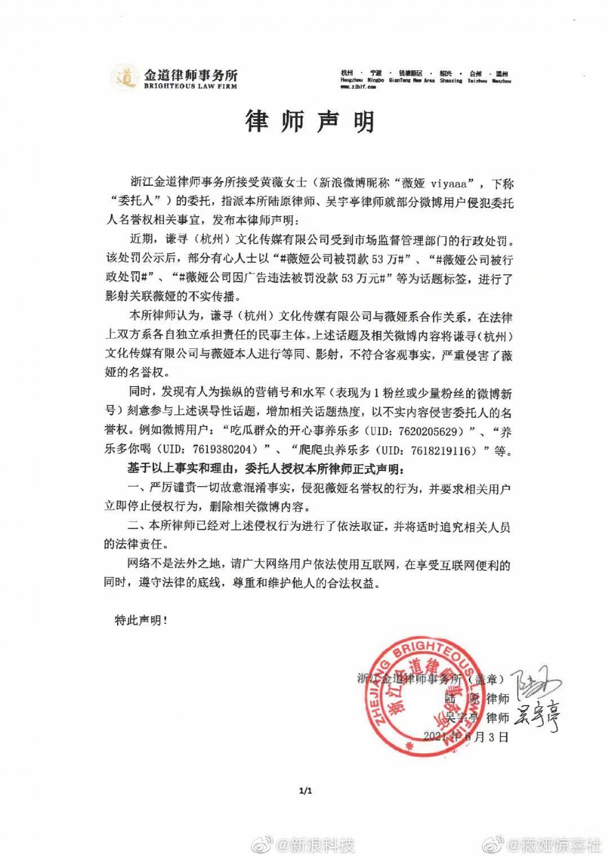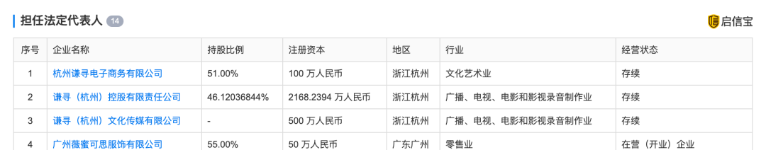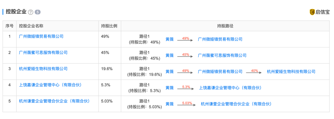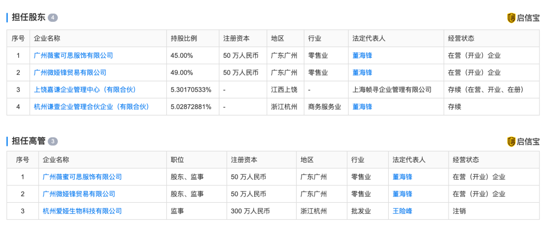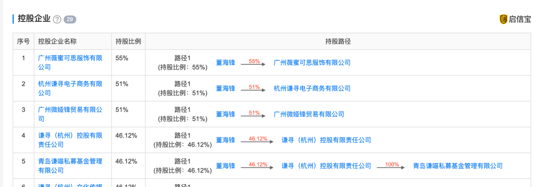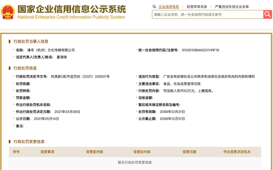 薇娅再陷风波!丈夫公司被罚53万,因广告违法行为 一年卖上百亿,夫妻二人身家90亿 因广告违法行为 薇娅丈夫公司被罚53万 近日,“直播一姐”薇娅关联公司谦寻(杭州)文化传媒有限公司被行政处罚,罚没款53万元,引发广泛关注。 国家企业信用信息公示系统显示,该公司处罚事由为“广告含有妨碍社会公共秩序和违背社会良好风尚的内容和情形”。主要违法事实为“食品、化妆品等宣传功效”,行政处罚内容为“罚没款人民币53万元,上缴国库”,作出行政处罚决定日期为2021年4月8日。 启信宝信息显示,谦寻文化注册资本为500万人民币,经营范围为广播电视节目制作经营、演出经纪、组织文化艺术交流等。谦寻文化董事长、法定代表人董海锋即为带货主播薇娅的丈夫。该公司由谦寻(杭州)控股有限责任公司全资持股,薇娅(本名黄薇)本人通过上饶嘉谦企业管理中心(有限合伙),间接持有涉事公司近1%股份。 据其官网介绍, 谦寻文化成立于2017年4月28日,是新内容电商直播机构TOP1。目前公司旗下共有50余位主播,其中包括薇娅、林依轮、李静、海清、李响、大左、李艾、高露等。 2018年起,谦寻往集团化管理方向发展,目前该公司已创建北京明星直播基地,杭州超级供应链基地,子公司谦娱娱乐负责实现内容变现,子公司谦禧文化负责IP授权业务。 图片来源:谦寻官网截图 薇娅团队紧急回应撇清关系 对于上述行政处罚信息,薇娅团队迅速发布声明,并与谦寻文化撇清关系。 就网传“薇娅公司被行政处罚”一事,薇娅律师声明称,谦寻文化与薇娅系合作关系,在法律上双方系各自独立承担责任的民事主体。“薇娅公司被行政处罚”等内容将谦寻(杭州)文化传媒有限公司与薇娅本人进行等同、影射,不符合客观事实。部分网络媒体将两者混淆对薇娅本人造成名誉权侵害。 此前被质疑售卖山寨联名商品 薇娅及谦寻文化道歉 5月14日,一款声称是Supreme与国产品牌古姿GUZI的联名款挂脖风扇在薇娅直播间售卖。 薇娅当晚在直播间介绍,这是潮牌Supreme首次与国货品牌古姿联名合作商品,售价仅为198元,并多次强调该产品是美国联名,非香港代理。 结果,这款198元的风扇,在次日就遭到了时尚博主Abestyle的公开质疑是山寨联名,而非美国潮牌。 随后,品牌方谦寻文化发布声明表示,“经过核查,我们深知本次推广产品存在授权争议,我们再次向公众致歉,但古姿GUZI和我们都难以从法律层面进行维权,这是谦寻和薇娅团队成长中值得被铭记的教训。”同时指出,公司绝不回避此次授权争议中应承担的责任,已主动向有关部门说明情况,且没有删除相关直播回放。 此外,5月28日,薇娅也在其微博公开道歉:“这次授权争议事件是我和我的团队永远铭记的教训,我们也绝不会回避此次事件中应该承担的责任。” 但这并非薇娅第一次陷入售假风波。 据中国基金报,2020年1月,意大利轻奢品牌ASH曾发文声明,多名消费者和消费渠道投诉“薇娅viya高端定制女鞋”淘宝店仿冒制作ASH品牌旗下多项产品,并在“薇娅viya直播间”销售。针对此事,ASH已委托发表律师督促有关单位和个人立即停止违法行为,收回、销毁已经投入市场的抄袭假冒产品。 同年3月,原创设计品牌squarecircle也在微博上指控薇娅在直播中销售的一款针织开衫毛衣的款式、设计完全类似于squarecircle 2019年12月在淘宝官方店铺上线售卖的商品,只是用了品质较差的纱线替换,实为“山寨品”。 此外,启信宝数据显示,薇娅旗下的公司此前也多次被列入异常经营名录。 2020年12月11日,薇娅担任公司股东的广州薇蜜可思服饰有限公司被列入经营异常名录,原因为“通过登记的住所或者经营场所无法联系”。而这并不是该公司第一次因此被列入异常经营名录。 2015年11月12日,广州薇蜜可思服饰有限公司被广州市因“通过登记的住所或者经营场所无法联系”被列入经营异常名录,作出决定机关为广州市工商行政管理局荔湾分局,直到2017年5月24日才被移出经营异常名录。 一年卖上百亿,夫妻二人身家90亿 与老干妈创始人、饿了么创始人齐名 薇娅本名黄薇,1985年出生于安徽。 在今年5月新财富发布《2021新财富500富人榜》上,年仅36岁的淘宝直播网红薇娅和董海锋夫妇以90亿身家成功登榜,位列第490名,与“风投女王”今日资本创始人徐新、饿了么创始人张旭豪,以及老干妈创始人陶华碧齐名。 据21世纪经济报道,而这一步,老干妈用了23年,张旭豪用了13年,薇娅只用了5年。 据悉,A股4200余家上市公司,2020年营收超过薇娅17亿元带货数额的,不足300家。至此,薇娅夫妻俩的财富值已经不言而喻。实际上,早在2020年11月,就有人爆料称薇娅年入50亿元。不过,薇娅随后在接受《封面》专访时做出了回应。她称自己2019年确实卖了100多亿,但年入50亿,月赚几个亿的说法真的夸张了。薇娅称钱都是老公在管,但真的没那么多。 图片来源:视频截图 公开资料显示,薇娅作为淘宝第一主播,淘宝粉丝1890万+,单场直播最高观看4300万+。同时,薇娅在多家公司担任股东、高管,旗下控股企业包括广州薇娅锋贸易有限公司等5家企业。 相较于薇娅而言,其丈夫董海峰则更多料理公司事务,且身份繁多。 启信宝数据显示,董海峰为14家公司的法人,其中包括谦寻控股、谦寻文化、谦寻娱乐、杭州谦壹企业管理合伙企业(有限合伙)等。 此外,董海峰具有29家企业的实际控制权,同时还在17家企业
