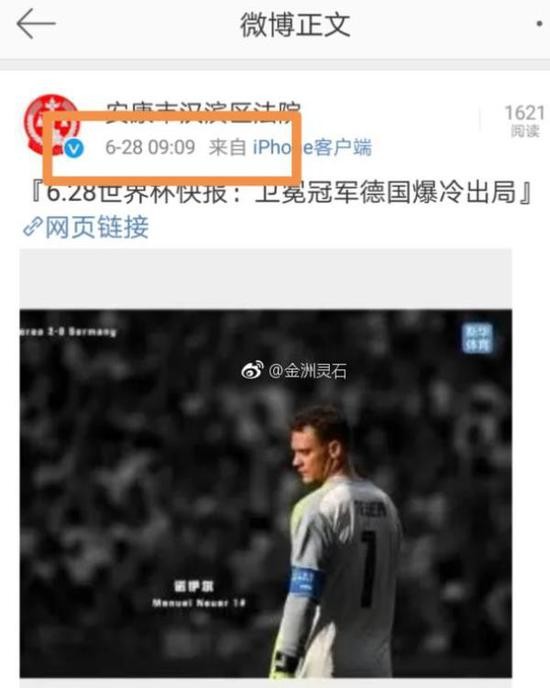法制晚报·看法新闻记者浏览汉滨区法院的官方微博,发现有多条世界杯的相关内容,包括“速报D组克罗地亚队阿根廷队出线”、“四场小组赛今晚明晨继续举行”、“世界杯16强对阵表!你看好谁”等内容。其中更有一条内容为“6.28世界杯快报:卫冕冠军德国队爆冷出局”的微博,发布时间为“6月28日09:09分”,恰好是正常工作日的上班时间。