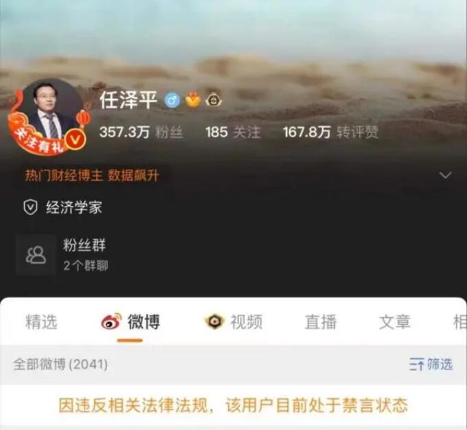 金融界1月12日消息 12日晚间,新浪微博显示网红经济学家任泽平的账号“因违反相关法律法规,该用户目前处于禁言状态”。