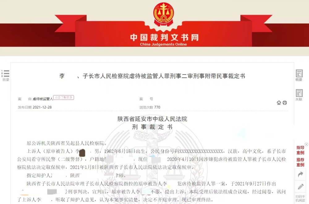 原标题:看守所民警被骗钱 让同监嫌犯帮忙要账:要不回你们也别好过 来源:潇湘晨报 2013年3月18日,因被人骗取数十万财物,陕西省子长市(2019年子长县撤县设市,后文均为“子长市”)公安局看守所民警李某某报警称被诈骗,涉嫌诈骗的嫌疑人马某某被抓获。在被羁押期间,马某某被同监室关押的监管人员栾某某等4人虐待、体罚致重伤。 然而7年后的2020年4月7日,此事的情节发生“转折”:陕西省子长市人民检察院对民警李某(即“李某某”)涉嫌虐待被监管人一案立案侦查。2021年9月27日,法院判决李某某犯虐待被监管人罪,判处有期徒刑三年,缓刑三年。二审维持原判。 举报李某某的,正是当时在看守所里殴打马某某的在押嫌犯栾某某。 裁判文书显示,陕西省子长市人民法院认定,李某某虽没有直接动手殴打、体罚被害人,也没有明示与被害人同监室的被监管人员进行殴打,但其行为均证实“要账”的事实,他曾对栾某某等人说:“(账)要不回来,我不好过了,你们也不得好过。” 2022年1月23日,李某某一审辩护律师向潇湘晨报记者透露,栾某某曾两次举报李某某涉嫌犯虐待被监管人罪。 辩护律师称,李某某有可能会申请再审,记者试图联系李某某了解案件详情,截至发稿未果。 男子诈骗看守所民警的钱,被抓后遭同监嫌犯殴打致重伤判决书显示,李某某,男,1962年生,高中文化,系子长市公安局看守所民警(二级警督)。 判决书披露了案件过程,2013年3月18日,当地村民马某某因涉嫌诈骗李某某31万元和一辆奥迪牌小轿车,被子长市公安局刑事拘留,并羁押于子长市看守所。 案件细节显示,马某某遭同监室关押的贾某某扇耳光。 判决书显示,被多人殴打后,马某某感觉腹部剧痛,口渴得厉害,一直睡在床上,同监室其他人也未将监室发生的事给管教报告,期间也没有及时进行救治。 2013年3月28日,马某某擦监室地板时昏迷倒地,当日被送往延安大学附属医院救治,被诊断为腹部闭合性损伤,脾破裂,左侧多发肋骨骨折,右侧肋骨骨折。2013年12月10日,经鉴定,马某某的损伤为重伤。 2015年4月14日,陕西省子长市人民法院以栾某某犯故意伤害罪,判处有期徒刑五年,与原判决合并刑期,最终以栾某某犯交通肇事罪、故意伤害罪,判处有期徒刑九年又六个月,民事赔偿43万余元。二审维持原判。 除栾某某外,该案其余三名共同被告人张某某、贾某某、杨某某均因犯故意伤害罪,于2015年4月14日被陕西省子长市人民法院判处有期徒刑三年到五年不等,三人上诉后,延安市中级人民法院终审裁定维持原判。 同监嫌犯举报:民警让其要账,称“在监室里只有打一种办法” 马某某在看守所遭殴打7年后,此事情节发生变化。 2020年4月13日,延安市人民检察院官方公号发布消息:2020年4月7日,陕西省子长市人民检察院对子长市公安局看守所民警李某涉嫌虐待被监管人一案立案侦查。 潇湘晨报记者注意到,马某某同监室号长栾某某为该案举报人。栾某某供述称,他于2013年8月因犯交通肇事罪服刑,2015年8月又因犯故意伤害罪服刑,他告诉前去探监的父亲,称其犯故意伤害罪是李某某造成的,因此让父亲写材料反映。 判决书显示,2019年8月13日,举报人栾某乙(栾某某父亲)、栾某某向延安市人民检察院举报李某某涉嫌犯虐待被监管人罪。 李某某到案后供述称,他于2012年3月认识马某某,当时马某某因涉嫌诈骗被羁押于子长市看守所,被取保释放后,马某某以其在关押期间受他照顾为由说要报答他,给他介绍生意,于是他先后出资31万多元和一辆奥迪车,后来得知被骗,便报了警。 马某某被关押到看守所次日,李某某到子长市看守所上班,将马某某骗自己的事告诉了13号监室号长栾某某,让栾某某安排马某某全天绷板(指双腿盘起坐下,两手放在腿上,腰挺直,头直端,两眼不能左右看),并为自己要账,嘱咐道“让马某某写上个东西,哪怕用房子顶账也行”。 而马某某亦在供述中说:他被关押到看守所第二天,李某某便对他说:“老马,我还把你当朋友,你把我做了这么一把子,你连我的钱都敢骗,你要知道你骗了迟早要进这个壳子,进了这个壳子叫你活个活不了,死个死不了。” 马某某说,动手打他的人是栾某某等人。后来他做脾脏切除手术,住院期间李某某来探望并道歉:“我当时冲动了,打你打得不对,你的事情我也不追究了”。马某某说,在他受伤之前,李某某多次将栾某某叫出去,而栾某某每次回来都让他还钱给李某某,不还钱就打他。 针对虐待一事,李某某辩解,他曾将自己被马某某骗的事告知栾某某,顺便让对方帮忙要账,没有多想,后来还让栾某某不要再打马某某了。李某某否认指使人殴打马某某一事,还称,如果马某某的伤是同监室的羁押人员殴打所致,他要承担管教应该承担的责任。 但同案犯栾某某供述,李某某每次提他出去就是说向马某某要钱的事,只让他想办法要钱,没有具体说什么办法,也没有说过对马某某动手或者不动手的话,但他自己认为,“在监室里只有打一种办法”。 法院:影响、暗示同监室其他被监管人员虐待、体罚被害人,构成虐待被监管人罪 2020年,子长市人民检察院以李某某犯虐待被监管人罪向子长市人民法院提起公诉。 庭上,李某某辩称他对马某某说过到了看守所不好受,让其好好守法,也和马某某说过还钱的事,但他一直没有给栾某某说过让其想办法向马某某要账,他提押栾某某是向其了解监室的事情,所以他不构成犯罪