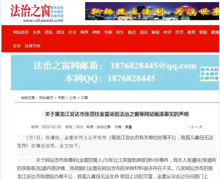 关于黑龙江安达市张遵柱金雷诋毁法治之窗等网站编造事实的声明 2月7日,张遵柱、金雷在网上公开发布《黑龙江安达市有关单位处理不公,致孤儿寡母无法生存》的情况说明。全文如下: 关于网站发布张尊利(金雷的爱人)与张云江房屋抵押借贷纠纷事件,我本人张遵柱(张道利的亲哥哥)知道内部详情,我弟媳妇金雷在网站发布的举报材料很多存在不实。几家网站发布的黑龙江安达市检察院办案不公,致孤儿寡母无法生存 挥泪上访的文章,金雷从没去过任何部门上访,一直在家与孩子生活,网站发表文章说金雷上访,这是编造事实,任何部门没有上访记录,文章内容多处与事实不符,网站发表不实文章后,金雷找到了法治之窗网站的工作人员,金雷的强烈要求下把不实的文章下架,后不知道什么原因又有几家网站发表此文章,金雷并没有委托其网站发表不实的文章,也没有其网站工作人员找金雷了解事实真相,网站不经核实就发表不实信息。因其网站发表的文章给金雷和家人造成很大的生活影响,决定对发布不实信息的网站追责。特此说明,要求网报,一瞅,法讯,民呼等网站撤稿,以免造成更大影响。2021年金雷到安达市报案,说自家的房子被人骗走了,安达市依法进行调查,找到了当事人和相关知情人等依法进行调查核实,证据确凿,认为被告人不够成犯罪,双方是属于经济纠纷,安达市出据了不予立案通知书,金雷随后向安达市检察院申请立案监督,安达市检察院接到申请后,依法对此案进行调查核实,核实后认为出据的不予立案理由充分。接到检察院的不予立案监督审查通知后,起初金雷还是想不明白,因为当年的事情是由她爱人张尊利所办,中间有很多过程细节金雷不知细情。经安达市调查后才还原了当年事实的真像。房子不是2017年2月6日当天卖的,是借款后一年左右出卖的,因为张遵柱知细情,常年不在家,回家过年才知道此事,特此澄清事实。当时出借人为了和借款日期相符,把更名后的房子票据写成2017年2月6日,金雷找到律师咨询此事,律师询问了此事的前后过程,并拿出相关材料,律师向金雷解释了相关的法律要件,让金雷到法院起诉,并要求网站撤稿,挽回金雷及相关部门名誉及其他损失。金雷这才明白应该怎么去拿起法律的武器来维护自己的利益,现在金雷决定找当事人商量和解此事,如果和解不成向法院提起诉讼。挽回自家的经济损失。 情况说明人:张遵柱 金雷 2022年2月5日