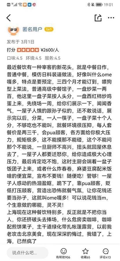 据极目新闻消息,近日有多位网友反映,上海一餐厅模仿日料做法,价格虚高菜品分量少,且用餐需提前几个月预定,流程过于繁琐,有故弄玄虚来宰客的嫌疑。 对此,该餐厅工作人员回复称:该餐厅新开业餐位有限,每天只接待10位顾客,价格是每人2000元加服务费。 关于争议,他们则表示不便多作回应,需顾客实际到店体验。 据悉,在一些点评平台有顾客对这家店评论称:“餐厅中餐模仿日料做法,特点是要预订,三四个月才能订到,一盘菜十个人分,份量也不多,每人套餐价是两三千元。” 另据网友展示的该餐厅菜品图片显示,燕窝蛋挞、日式白身鱼的刺身、加拿大象拔蚌等菜品分量较少,还有一个餐盘中,只摆放了切开的两瓣皮蛋。 还有网友称,一道名为贵妃鸡的菜品,厨师做好后会到顾客面前巡场一周,接着拿到后厨切分,偌大的鸡只取大腿部最精华的一片。 上述相关网贴引网友热议,有人质疑该餐厅内容大于形式,向顾客收智商税。 还有网友称类似这种餐馆走的是“中餐日作”的路线,“会PUA顾客,各方面给你极大压力,规矩极多,这不能碰那不能碰,一旦厨师不高兴,扭头回屋休息去了。” |