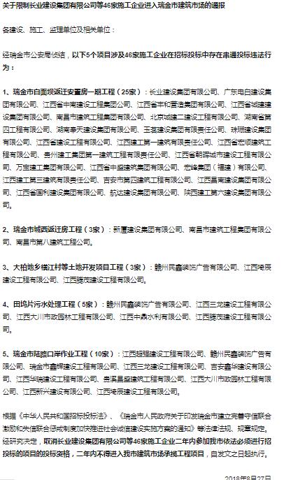 关于限制长业建设集团有限公司等46家施工企业进入瑞金市建筑市场的通报