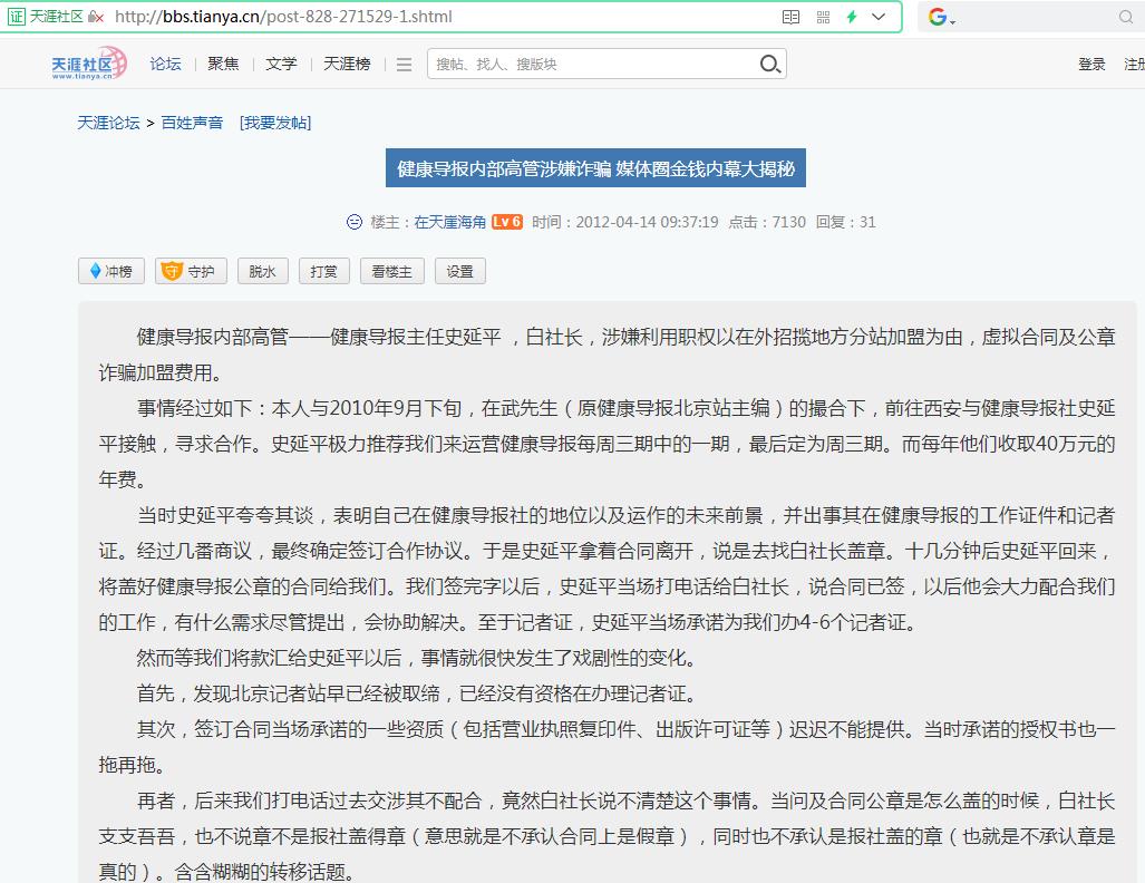 健康导报内部高管——健康导报主任史延平 ,白社长,涉嫌利用职权以在外招揽地方分站加盟为由,虚拟合同及公章诈骗加盟费用。