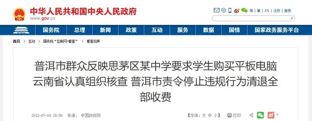 原标题:云南一中学以是否购5800元平板定分班?当地政府:属实 中国政府网7月4日消息,普洱市张先生通过国务院“互联网+督查”平台反映,思茅区第四中学以是否购买平板电脑划分智慧班和传统班,智慧班的学生需要花5800元购买平板电脑。 国办督查室收到相关留言后,经初步核实,及时转有关地方政府核查办理。云南省政府接到国办督查室转办的问题线索后,立即组织开展核查。 经核查,群众反映情况属实。自2020年秋季学期开始,云南省普洱市思茅区第四中学以是否购买平板电脑为依据,将新入学的七年级学生分为智慧班和普通班,要求14个智慧班的719名学生按照5800元/套标准购买平板电脑、配套设备及资源服务。截至督查时,719名学生已每人缴纳3400元(包括平板电脑、配套设备及第一学年资源服务费),收费总额为244.46万元。 上述行为违反教育部等五部门《关于进一步加强和规范教育收费管理的意见》(教财〔2020〕5号)中“不得强制或者暗示学生及家长购买指定的教辅软件或资料”和教育部等八部门《关于引导规范教育移动互联网应用有序健康发展的意见》(教技函〔2019〕55号)中“作为教学、管理工具要求统一使用的教育移动应用,不得向学生及家长收取任何费用”的规定,加重了学生家庭的负担。 普洱市有关部门已责令该校立即停止违规收费行为,取消智慧班与普通班分班,督促该校向719名学生退还了全部违规收费244.46万元,并将平板电脑、配套设备及教学资源收回供统一教学使用。同时,思茅区教育局召开全区教育系统专题会议,对第四中学违规问题予以通报批评,举一反三组织开展违规收费问题集中排查整治行动,进一步加强监督管理。 |