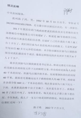 阜阳九旬老农反映新乌江镇不按文件补偿致难生存