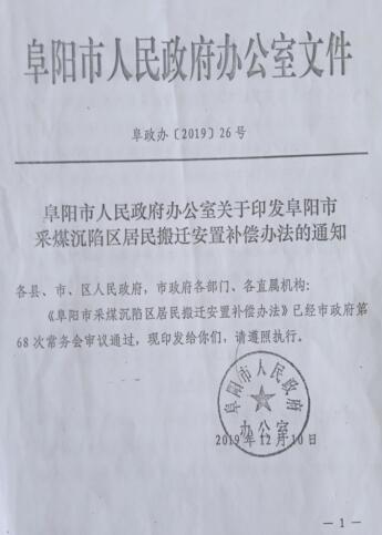 阜阳市政府办(2019)26号文件印发了《阜阳市采煤沉陷区居民搬迁安置补偿办法》是经市政府常务会议审议通过政策。