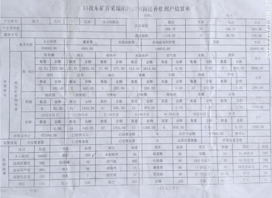 从这份《口孜东矿首采塌陷区四期拆迁补偿到户结算单》看出:陈子鸿和儿子共七口人,每人5万元人口补偿是大头。房屋面积达454.28平方米,仅给了超面积补偿10.6万元,加上搬家费,简易棚、墙头、地坪及果树杂树等总补偿款仅仅47.7566万元,安置情况却没有!也就是说没有给予安置房。