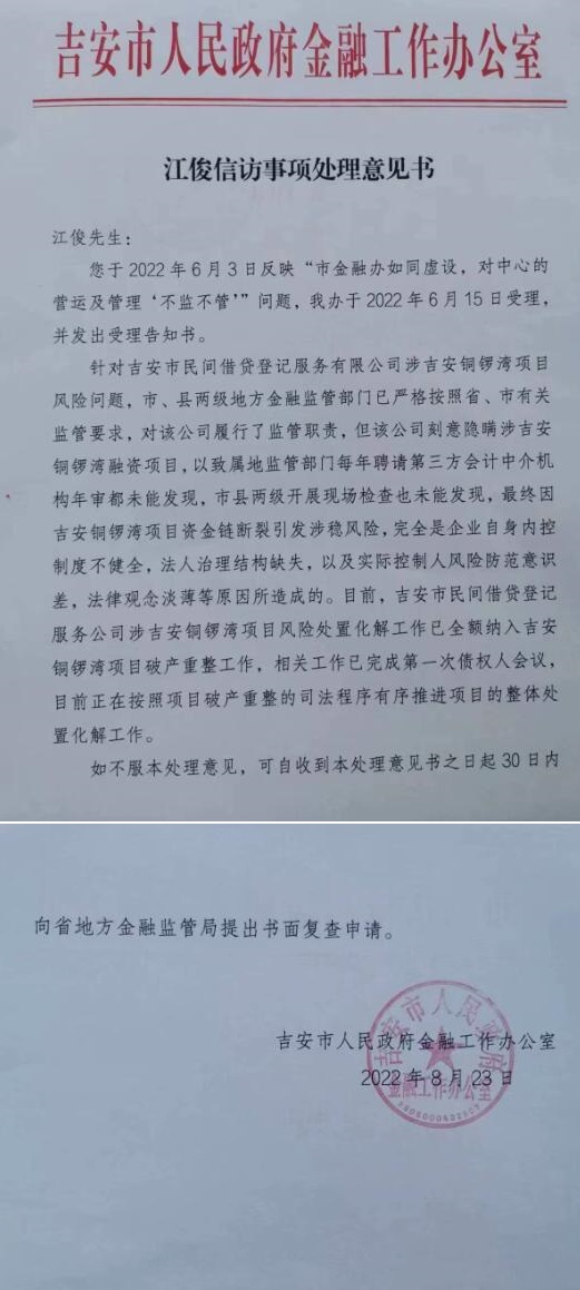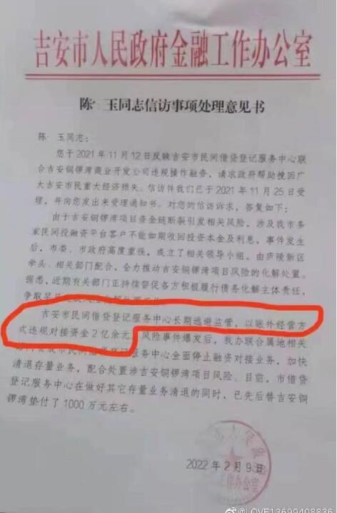 | 吉安借贷中心资金暴雷 吉安不平安、百姓遭欺辱、追债新旧三年怪事多多 撰稿 /文韬 **江西吉安市借贷中心涉嫌合同诈骗融资崩盘暴雷,新旧三年,拒不履约还款。《借款合同》无人问无人管。 **年迈74岁出借人熊火根向市借贷中心出借资金150万,病危向市委书记王某玄求助借款几万元,没得到回应,市借贷中心董事长徐某辉,更是恶劣,电话不接,信息不回。熊火根心急如焚,从病发至死亡,仅仅一个月左右的时间。 **明显的合同诈骗,吉安上下统一口径不立案,吉安百名出借人网上集体实名举报,近200名出借人向吉安政府立“血书”,誓死捍卫法律的尊严,誓死捍卫自己的合法权益,请求吉安政府把正义还给百姓,还给受害人 江西吉安铜锣湾项目,是吉安市政府招商引资项目。吉安市民间借贷登记服务有限公司,打着“为政府解忧、为民众解愁”旗号。经吉安政府于2014年批准成立。为了对老百姓更有欺骗性,将“民间借贷登记服务有限公司”改为“借贷中心”,挂牌在吉安政府大楼的行政办事服务中心这一耀眼的位置,吉安新闻媒体的大力宣传,原市长现升任为书记王某玄亲临现场视察指导的报道,让老百姓对资金的安全性深信不疑。加之业务员巧舌如簧,一套套引诱的说词:政府倡导或支持的;有金融办监督管理,借贷中心与市金融办联网了,每一笔融资款,在市金融办能查到资金的流向;借贷中心承诺了“受让”债权,有财产抵押,安全可靠……等等,出借人出于对政府的信任和对资金安全性及其以利息贴补家庭生活的考虑,将家里省吃节用的养老钱、预留看病的、给孩子读书的、买房款以及房屋拆迁补贴款……全都一股脑的出借给借贷中心。 哪知,这是一个“黑洞”。吉安铜锣湾只是一个洗钱融资的导具。吉安铜锣湾项目的股东,也是借贷中心的股东,股东自己为自己借款。出借的款由借贷中心指定打在吉安铜锣湾股东亲属或公司员工的私人帐户中,然后由其个人帐户再转到借贷中心的其它个人帐户,在《借贷合同》上,有三方签字盖章或按手印,本应该是一式三份存档,可是合同体现的只是一式二份,即出借人和借贷中心各持一份。收款人、借钱人、用钱人本该是同一主体,但在《借款合同》中表现的是三个不同主体,在《借款合同》中明确借贷中心具有“合同管理权”,同时借贷中心承诺“债权受让”。事实上,借贷中心不具备“债权受让”的能力,却又承诺受让。这种行为说明了什么?从合同法的角度讲;从民典法理上以及从国家税法的角度上讲,如此行为该如何解释? 钱究竟到哪儿去了?出借资金开发的资产所形成的价值应该是大大高于出借的资金,怎么会亏?何况吉安政府给的是超低廉价格的土地,仅凭土地其价值就非常可观。加之政府招商引资的奖励及其补贴,可不是小数啊! 市金融办在2018年行文对借贷中心下发了吉安铜锣湾风险提示,但虽“发”却未“管”。借贷中心并不因此而引以为戒,规避风险。相反,借吉安铜锣湾项目之名,变本加厉,肆意妄为地向社会继续融资,拆东墙补西墙,甚至借机抽逃资金,临近暴雷的前10天还向出借人推出项目融资。据不完全统计,仅借贷中心在2020年12个月中,借贷中心与734户签了近上千份的借款合同,总金额2.1亿。另有其他借款2个亿,一年之内总借款4亿多,超限额3亿之多。市金融办在给出借人的信访回复件中认定:借贷中心长期逃避金融监管,以账外经营的方式违规对接资金2亿余元。 纸包不住火。于2020年12月18日,借贷中心以“清理微信群”为由,悄悄地解散出借人融资微信群,在这样情况下,出借人才发现受骗了。尤其是12月20日是利息支付日,借贷中心没有兑付,资金断链的真相终于浮出水面。。 吉安市借贷中心涉嫌合同诈骗融资崩盘,危害734户家庭,上千余人。其中:60岁以上占60%;70岁以上的31人,80岁以上的7人,患各种癌症,换肾、透析、心梗、脑梗、脑瘫、肺栓塞、高危高血压和其他高危病人35人, 令人寒心的是一对老龄夫妻90万的买房款被骗,丈夫79岁,患有心梗、脑梗,冠心病、高危高血压、二型糖尿病等疾病。因原旧房无电梯,在六层,年老体弱爬不动了,卖掉想换电梯房,又因不能按揭,暂出借给借贷中心,结果被吃掉了。现在四处流浪,无家可归。 另一对老夫妻(男性80岁,女性75岁),因儿子在前些年过世,考虑年老多病,为养老治病,以防不测,于2020年卖掉房子。就在办理房产过户手续时,恰遇借贷中心业务员,业务员连哄带骗,两老把卖房钱及全部家当都给了借贷中心。资金爆雷事发后,两老惊吓了,两人患了脑梗,先后几次双双住院,如今整日以泪洗面,有时想找政府诉苦,找骗子追债,但由于債事的打击,犯糊涂,坐着公交车来回绕了几圈,不知道该朝什么方向或往哪个位置走,才能回家。 ![]() (二) 出借的资金要不回,出借人急的发跳。为追回被骗的血汗钱,出借人首先想到要找政府,向政府求助。于2021年元月18日,出借人自发的到了市政府的广场,请求见当时的市长王某玄,却料想不到的是:没有领导出面见受害人予以安慰或疏导。相反是公安一拥而上,将9名出借人抓进监狱,9人中有患心脏病心脏装有支架的和患有高血压、孝喘病的患者,其中还有一位女性青年被四个公安按倒在地,头部脸部被按的贴在地面,胫部被公安用腿顶压着,反扭双手带上铐……在法制社会的今天,我不敢相信,公安却敢这样的干?肇事骗钱的不抓反倒抓受害受骗的出