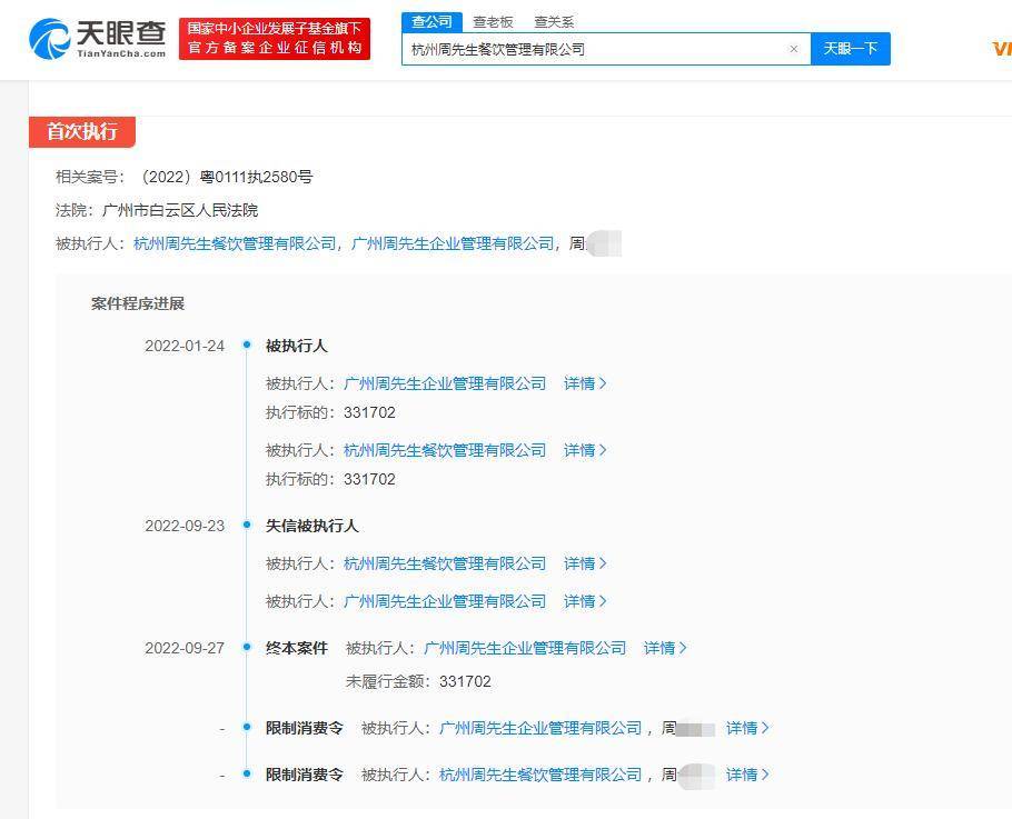 据天眼查App显示,近日,广州周先生企业管理有限公司和杭州周先生餐饮管理有限公司因有履行能力而拒不履行生效法律文书确定义务,被广州市白云区人民法院列为失信被执行人(老赖)。详情显示,此前两公司被法院强制执行停止在其门店宣传物料上使用胡歌的肖像、姓名的侵权行为并下架侵权宣传物料;向胡歌赔偿经济损失及合理维权开支等共计33万余元。此外,两公司及法定代表人已于近日被限制高消费,该案被列为终本案件。