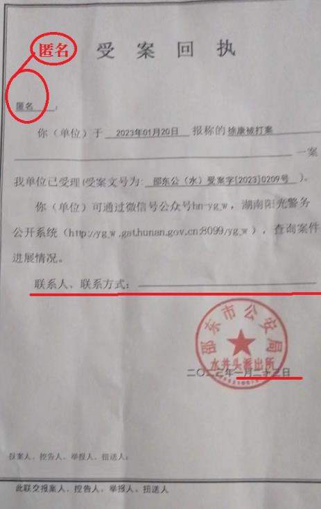 2月10日下午一点多,法讯网发布了《湖南邵东市富商杨宗昌强占耕地葬母还棒打村民为啥无人管》,之后邵东市公安局水井头派出所赵所长亲自到受害者徐康家里,将“受案回执”交到徐康手里,由其签收。并表示在2月12日调解,杨宗昌兄弟会到场。