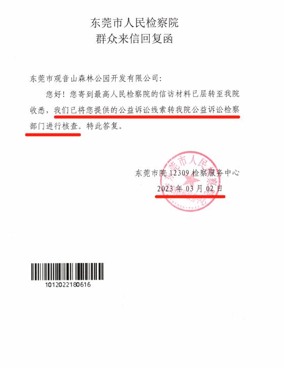 2023年3月2日,观音山公园收到东莞市检察院的回复函。回复称“您好!您寄到最高人民检察院的信访材料已层转至我院收悉,我们已将您提供的公益诉讼线索转我院公益诉讼检察部门进行核查。特此答复。”