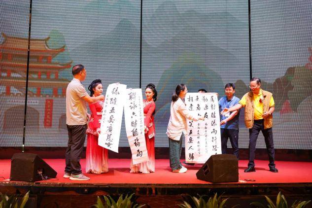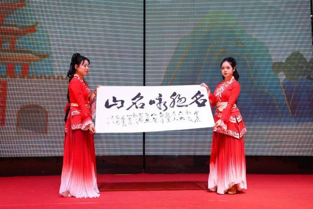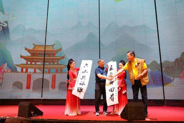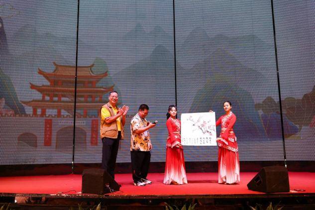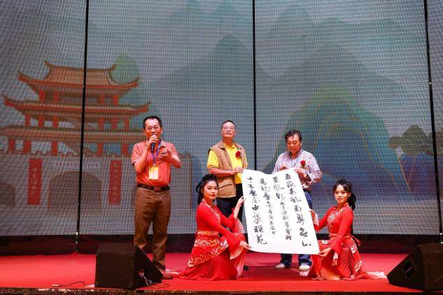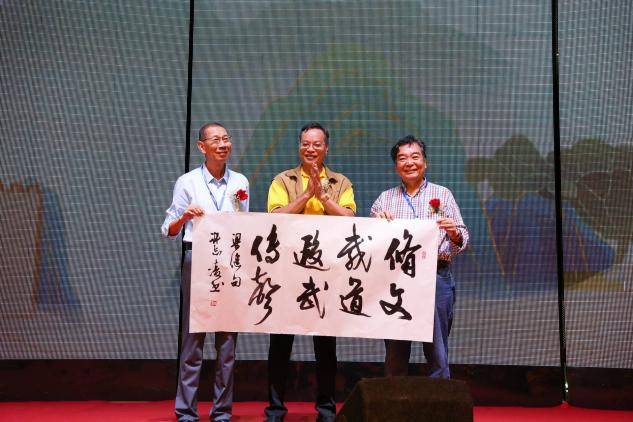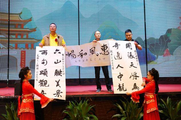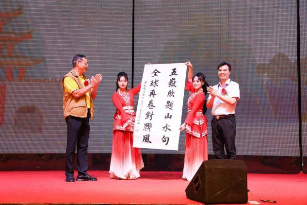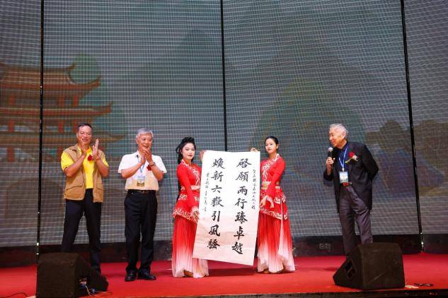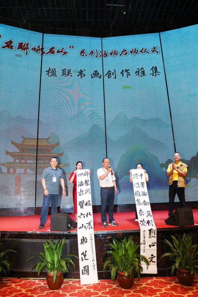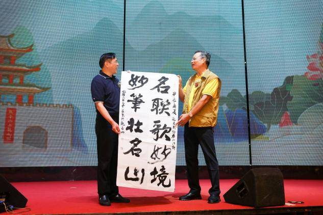 启动仪式后是赠送墨宝庆繁荣!中国楹联学会顾委会副主任、广东楹联学会老会长邹继海先生在展示“名联咏名山”书法作品时邹继海会长表示:“今天,‘名联咏名山‘首届启动仪式的举行,是我们这次研讨会的开始,以后会一届接着一届的办下去,为传承中国传统楹联文化发光发热,让我们一起期待、见证名山、名联文化的发展、繁荣。”