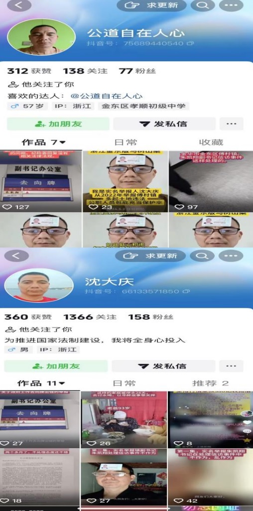 出生于1967年的沈大庆是举报人之一,原来经营一家装修公司。他因多次举报村干部多种违法违规行为,镇政府都没有给予答复,为此他在抖音上多次发视频举报。