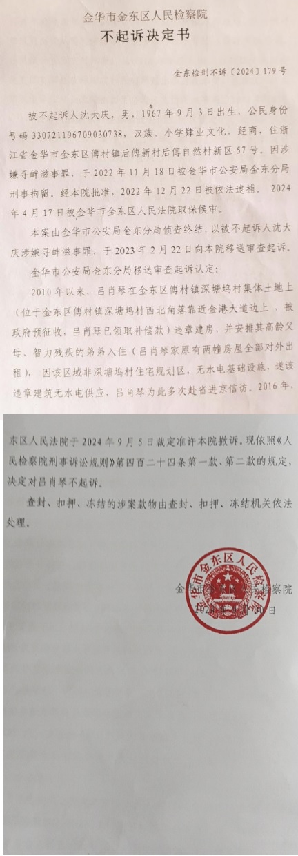 9月30日,金东区检察院分别对沈大庆、吕肖琴、吕月琴三人作出了不起诉决定。