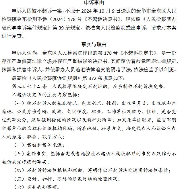 贾霆律师认为,仅有检察院的撤诉是不够的,万一哪天他们又起诉了咋办?于是,他指导吕肖琴向金东区检察院递交了《不起诉决定申请书》,要求检察院作出不起诉决定。接着,沈大庆、吕月琴也检察院递交了《不起诉决定申请书》。
