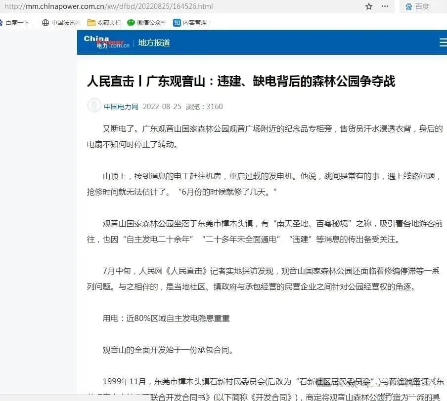 中国电力网转载的人民网文章《人民直击丨广东观音山:违建、缺电背后的森林公园争夺战》