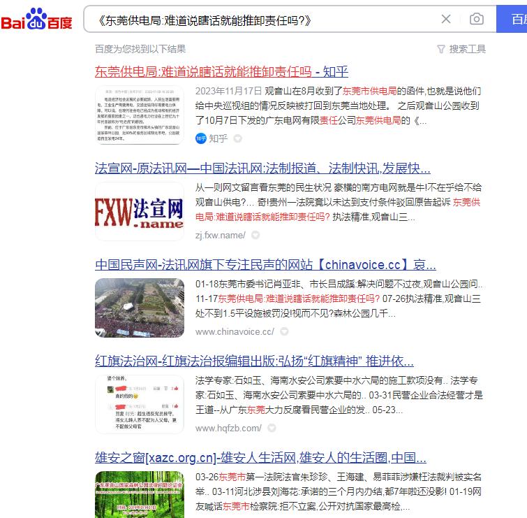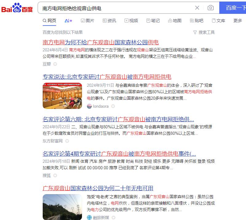 追溯南方电网不给观音山公园供电的网络曝光,近年来的网页多达数百篇,《观音山公司诉南方电网等侵权案在广东开庭》、《东莞维权有多难?供电部门22年不给民企观音山供电》、《东莞市电力部门长期拒绝给观音山国家森林公园供电何解》、《广东观音山国家森林公园依法申请用电 东莞供电局长期拒绝供电并企图推卸责任》、《“小香港”之称的繁荣地,存在未通市政电力之现象》、《广东观音山国家森林公园多年缺电频遭毁林的背后》、《首座民营国家级森林公园遇通电难题 欲借纾困潮破局》、《“电老虎”现形记:东莞国家级景区供电被卡脖子23年》、《自主供电23年 广东观音山国家森林公园何时全面通电》、《东莞民企艰难发展之路:在那些没电的日子里》、《国家森林公园遭遇“电老虎” 24年用电问题悬而未决》、《东莞民企给供电局送“锦旗”,希望解决公园80%服务区域用电》、《给国家森林公园供电 点亮东莞民企发展的希望》、《广东观音山如何从黑夜走向万家灯火》、《25年经营权争夺余波:观音山国家森林公园遭电力部门“卡脖》、《25年黑灯瞎火,东莞民企送锦旗只为能见“光明”》、《豪横的南方电网就是牛!不在乎给不给观音山供电?!》、《南方电网为何不给广东观音山国家森林公园供电》、《公园要求用电可以吗?专家:不能拒绝供电》、《东莞供电局:难道说瞎话就能推卸责任吗?》、在2024年9月《名家评论专家研讨广东观音山被南方电网拒绝供电事件》就有七期......