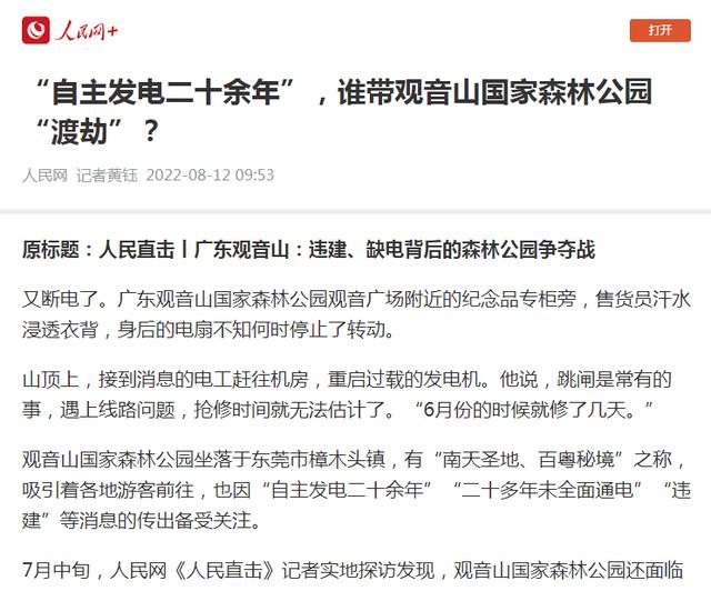 人民网在2022年8月发布的《“自主发电二十余年”,谁带观音山国家森林公园“渡劫”?》