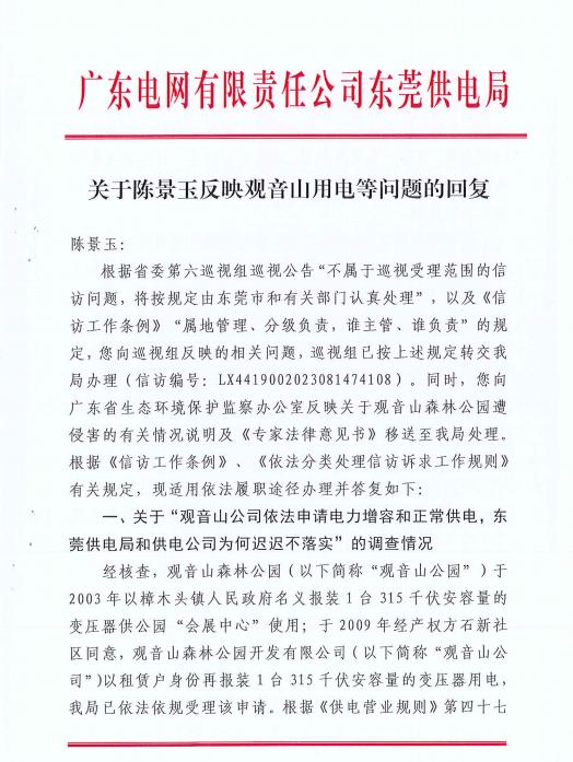 此举更是惹怒了南方电网,东莞市供电局竟违规将观音山纳入错峰用电对象,“电老虎”横行霸道,并对观音山26年申请供电置之不理。