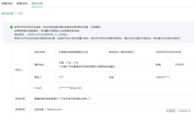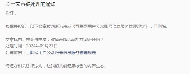 同时,公众号文章《东莞供电局:难道说瞎话就能推卸责任吗?》被投诉删除