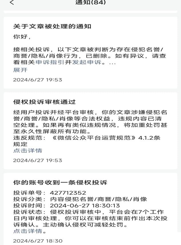 但在19:53,微信公众号即发来通知,确认“你的内容经查涉嫌内容侵犯名誉/隐私/肖像,已被删除”。