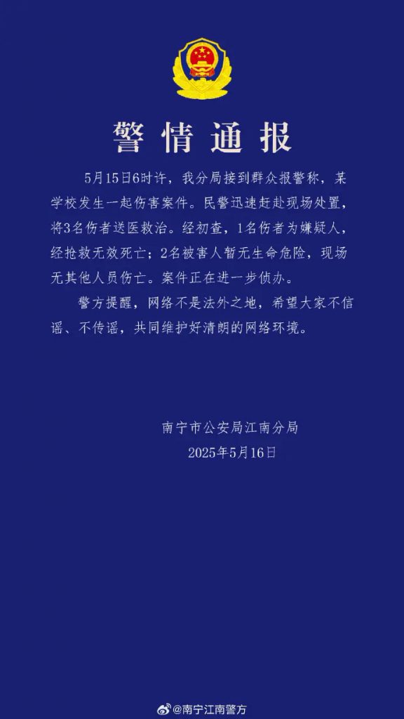 「原标题:广西南宁某学校发生一起伤害案件 警方通报:嫌疑人死亡 」