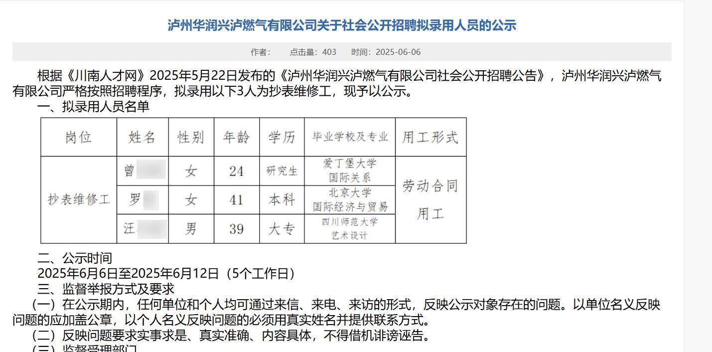 泸州一燃气公司拟招北大毕业生当抄表维修工?多方回应 极目新闻记者 丁伟 近日,有网友分享了泸州华润兴泸燃气有限公司关于社会公开招聘拟录用人员的公示名单截图。截图显示,公司拟录用3名抄表维修工,一名为24岁的爱丁堡大学国际关系专业研究生,一名为41岁的北京大学国际经济与贸易专业本科生,另一名为39岁的四川师范大学艺术设计专业毕业的大专生,此信息引发关注。 有网友表示,该截图来自川南人才网。9日中午,记者登录该网站,尝试多次都无法登录。随后记者拨打该网站电话,工作人员表示,网站暂时在维护,导致一时无法正常登录。网站工作人员确认,泸州华润兴泸燃气有限公司拟录用的三名抄表维修工分别为毕业于爱丁堡大学国际关系专业的曾某某、毕业于北京大学国际经济与贸易专业的罗某、毕业于四川师范大学艺术设计专业的汪某某。