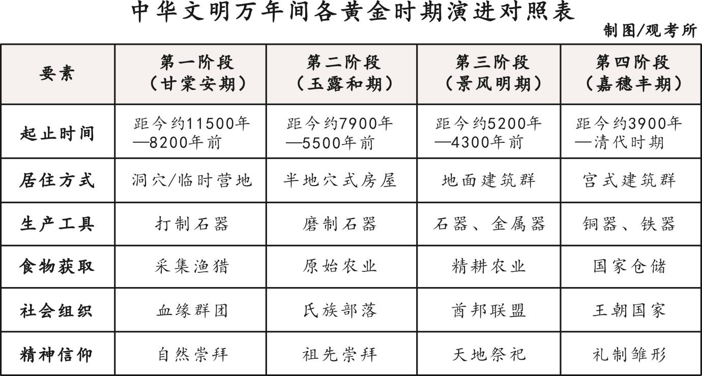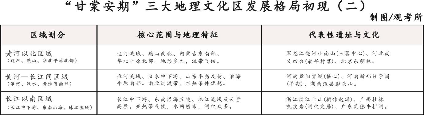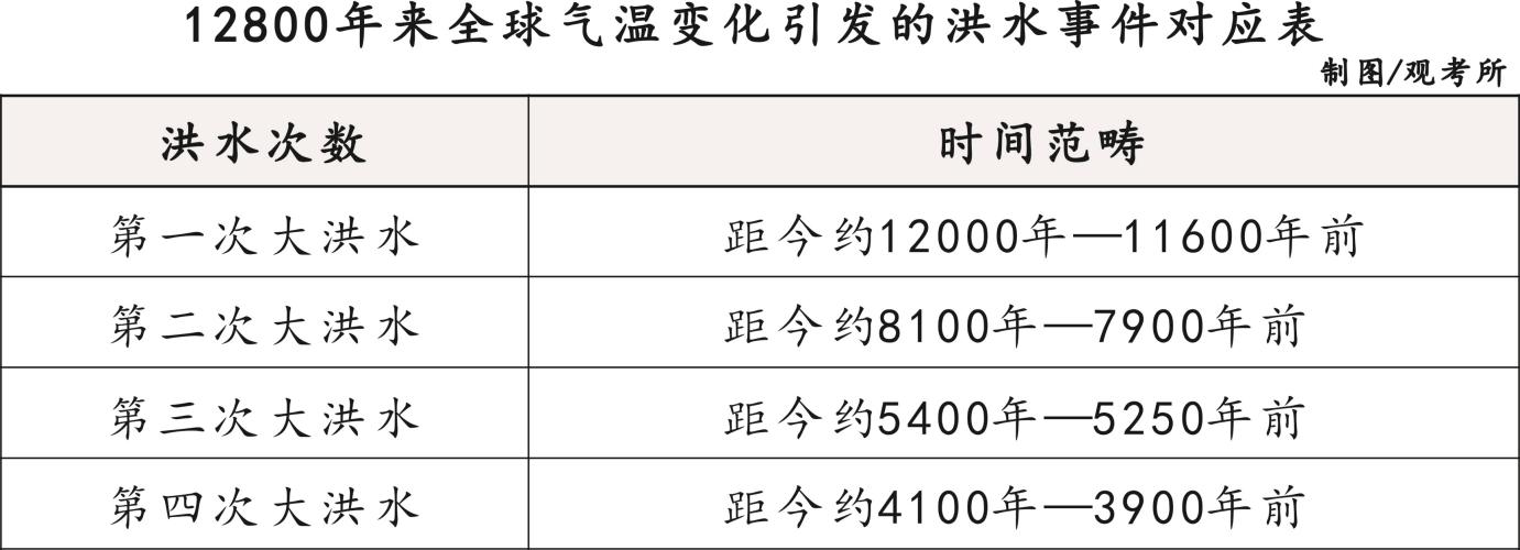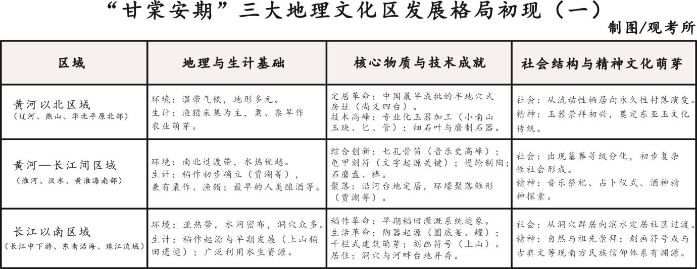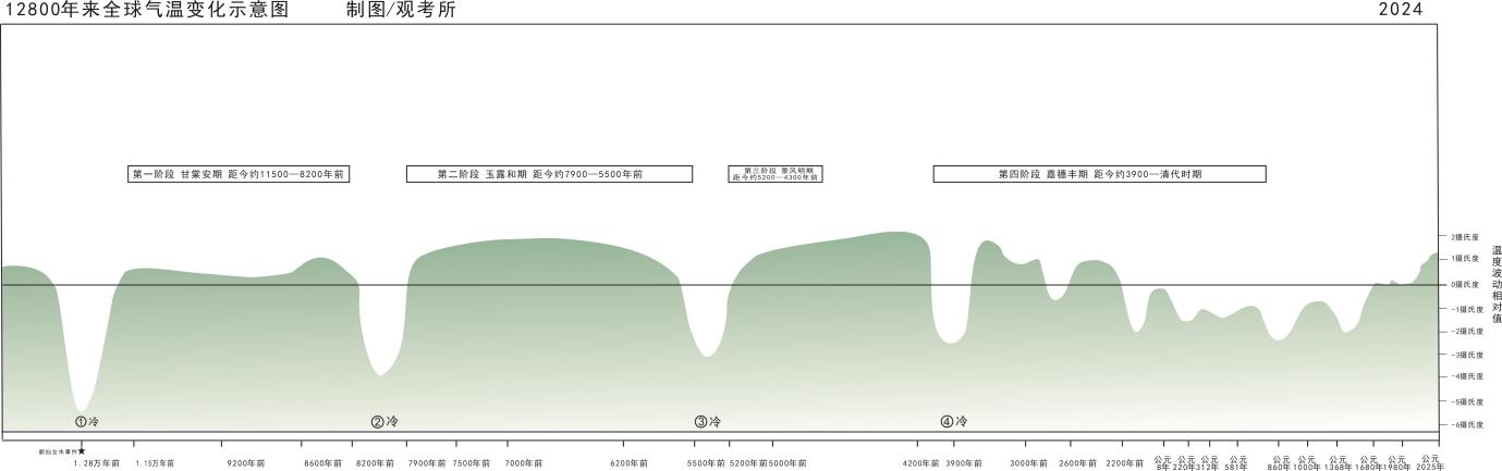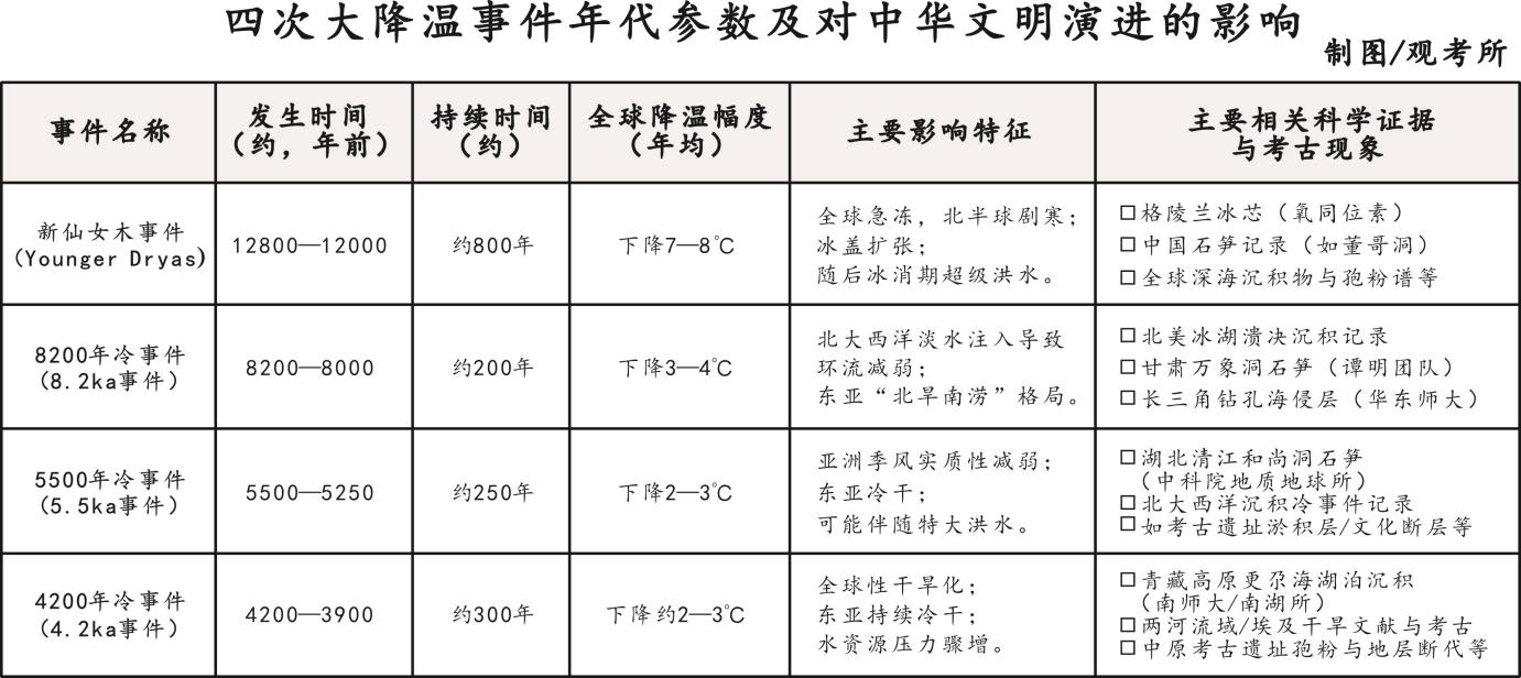 开篇:四张核心图表的启示——解码气候与文化演进的万年对话 在我们脚下这片孕育了人类文明、看似永恒的土地之下,其实埋藏着一部惊心动魄的万年史诗。这部史诗的篇章,由冰与火、水与土交替书写,主角是我们的祖先,导演则是反复无常的全球气候。 谁来揭示它?这可能吗?又有何种震撼人心的学术价值?一个全球性的文化谜题为我们提供了线索:据统计,全世界有超过600个民族的神话与传说中,都有关于大洪水的描述。其范围之广,跨越五大洲,这难道仅仅是巧合?还是远古人类对一段共同恐怖记忆的集体回响?真实情况究竟如何?是一场席卷全球的单一灾难,还是周期性上演的天地浩劫?时至今日,我们理应运用现代科学的力量,综合多学科的研究成果,对这一塑造了人类命运的现象进行系统性的解码。 您是否想过,在文字尚未诞生的蒙昧年代,我们的先祖是如何面对那足以抹平一切、持续数十年甚至数百年的万古寒荒般的严寒,以及随之而来的、吞噬家园的滔天大洪水?文明微弱的火种,又是如何在极端的冰封与滔天的洪流中得以保存,并最终燃成照亮东方的燎原之火?中华文明的坚韧幼苗,如何在万年前的冻土中萌发,一路栉风沐雨,长成参天巨树,并在全球古文明大多已中断的背景下硕果仅存,成为人类万年历史绵延至今的主要古老文明体之一。 能为这些疑问提供系统性答案的离不开这四张核心图表。 图一:12800年来全球气温变化示意图 图二:四次大降温事件年代参数及对中华文明演进的影响 图三:12800年来全球气温变化引发的洪水事件对应表 图四:中华文明万年间各黄金时期演进对照表 这四张图表绝非冰冷数据的简单罗列。它们是一个全新研究范式的呈现——“气候—文明互动分析框架”,该范式由东莞观音山考古研究所团队经过多年探索,在充分吸纳前人成果、去伪存真的基础上,创造性地融合古气候学、地质学、考古学、古天文学、分子人类学、语言学等多学科方法而提出。它清晰地揭示:中华文明的发展节奏,与全球气候的周期性剧变息息相关,文明的每一次重大进步,都深深烙刻着适应环境挑战的印记。 本文正是运用这一范式,首次尝试以“黄河以北”“黄河—长江之间”“长江以南”这三大具有鲜明生态与文化差异的地理舞台为叙事主线,带领读者重返那段波澜壮阔的岁月。我们将看到,从约12800年前“新仙女木事件”的毁灭性寒冬,再到约5500年前各大区域文明百花齐放的鼎盛时期,气候如何像一只无形巨手,塑造着中华大地的山河地貌,筛选着动植物种群,也锤炼着我们祖先的生存策略、社会组织与精神世界。这是一部关于生存、适应与创造的万年史诗,而“大考古观”下的“观音山新范式”,正是我们打开这部史诗之门的钥匙。 本文的核心在于重点讲述中华文明的发展历程,故世界其他地区的文明演进进程在此暂且不表。然而,本文所构建的“气候—文明互动”分析框架具有普适性。若能以此框架为工具,参照世界其他各地的考古证据,亦可勾勒出全球其他各大洲及各地理单元的基本概况。 本文在广义上使用“中华文明”一词,指代在中华大地上自万年前以来孕育、发展,并最终形成连续不断文化传统的整个进程,其早期阶段通常被称为“文化”或“复杂社会”。 第一部分:“四表”的学术价值与考古赋能 1.总述“四表”揭示的宏观规律与文明韧性 上述四张核心图表揭示了一个超越线性史观的宏观规律:中华文明的发展轨迹,并非一帆风顺的坦途,而是在“气候剧烈降温—冰川扩张大面积南下—气候急速回暖—冰川崩解消融—特大洪水席卷—冲积平原扩展—气候相对稳定—万物蓬勃生长—新一轮降温”的周期性震荡中,经历着毁灭性打击与奇迹般的重生。每一次全球性的环境剧变之后,往往迎来一段长达数百乃至数千年的相对稳定期,即“黄金时期”。文明的薪火就在这“毁灭(剧变)—重建(黄金期初期)—发展(黄金期鼎盛)”的循环中,一次次淬炼,一步步迈向更高阶的复杂社会。 我们将这种在极端环境压力下不仅能够存续、更能实现复苏与跃升的能力,定义为中华文明早期韧性的核心体现。而“四表”所构建的“气候—文明互动分析框架”,正是我们解码这份万年韧性的关键工具之一。 2.介绍四大黄金期的文化命名(甘棠安期、玉露和期、景风明期、嘉穗丰期)及其人文内涵 观音山考古研究所研究团队以众多学科考古成果为基础,创造性地从中华典籍中提炼出具有深厚文化内涵的命名体系——“甘棠安期”(约11500年—8200年前)、“玉露和期”(约7900年—5500年前)、“景风明期”(约5200年—4300年前)与“嘉穗丰期”(约3900年前—清代时期)。这套命名不仅根植于考古实证,更承载着对文明韧性的深刻理解,通过科学与人文交融的叙事框架,向世界展现中华文明在万年气候挑战中持续发展的独特智慧。 从这一宏大视角延伸开来,我们发现世界其他各大洲古人类的命运走向,与这四张图揭示的气候律动同样密不可分。不同的是,由于地理环境、资源禀赋和社会结构等多重复杂原因,其他大陆的古文明在严酷的气候挑战下都相继中断,未能将火种传递至今。唯有中华文明凭借其优越的地理环境和独特的适应智慧、坚韧的社会组织及强大的文化凝聚力,百折不挠,长盛不衰,在一次次劫难后焕发新的生机,发扬光大,最终成为人类文明史上最具代表
