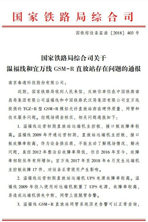 国家铁路局综合司 国铁综设备监函[2018] 403号 国家铁路局综合司关于温福线和宜万线GSM-R直放站存在问题的通报 南京泰通科技股份有限公司: 近期,国家铁路局收到人民来信,反映你单位在中国铁路南昌局集团有限公司温福线和中国铁路武汉局集团有限公司宜万线提供的TGZ-R型GSM-R模拟光纤直放站存在硬件质量、网管和技术服务问题。经现场调查核实,相关问题通报如下: 1.温福线运营初期直放站远端机主控板、接口板故障率较高。温福线2009年开通运营初期,直放站远端机主控板、接口板故障率较高,作为设备供应商,不能主动了解现场情况、解决问题,虽经2012年整治后故障率降低,但自2016年至今,故障率相较往年有所增加;宜万线2017年至2018年6月发生远端机主控板故障17件,对设备正常使用产生影响。 2.温福线运营初期直放站远端机UPS电源故障率较高。温福线2009年投入使用时远端机配置了UPS电源,故障率较高,易造成远端机供电中断,网管上报脱管告警。 3.温福线GSM-R直放站网管系统历史告警可以正常查询,但告警过滤规则不完善,存在无用告警信息、误告警信息过多的问题;系统自动统计大量持续数秒告警,实际告警并不在网管系统上报,虽然设备工作状况正常,但每月告警统计均在2000条以上,误告警信息量较大,造成告警信息分析工作量大。 4.温福线樟林-福州01-R2 FZXL K5+970远端机机房、宜万线鲁竹坝二号隧道内远端机光远184号,供电连接线采用焊接方式,更换时需要使用电烙铁,不如螺丝固定方式或插接式方便,给现场维护带来不便。 5.温福线樟林-福州01-R2 FZXL K5+970远端机机房、宜万线鲁竹坝二号隧道内远端机光远184号,电源模块端子较多,虽采用螺丝固定、连接强度较高,但更换时不如插接式方便,给现场维修带来不便。 6.温福线樟林-福州01-R2 FZXL K5+970远端机机房,存在功放板距离电源线和尾纤距离较近的问题,尾纤易产生高温老化。 7.直放站远端机内部设计较为紧促,更换光模块时需要拆卸动环模块,给现场维护带来不便。 8.宜万线GSM-R直放站网管系统早期版本软件存在操作频繁或鼠标点击频率过快时,有死机现象。 针对上述问题,请你单位认真分析原因,提出整改措施,并举一反三,对使用你单位设备的其他运营线路进行回访,及时发现问题、解决问题,确保设备正常使用。 请于2018年9月底前将整改措施和回访情况报国家铁路局设备监督管理司。 特此通报。 国家铁路局综合司 2018年8月22日  同日,国家铁路局对涉及使用南京泰通提供TGZ-R型GSM-R模拟光纤直放站的单位中国铁路南昌局集团有限公司、中国铁路武汉局集团有限公司、中铁二十二局集团有限公司对于施工及设备维护存在问题进行了通报。