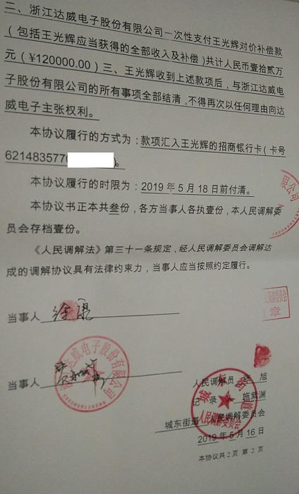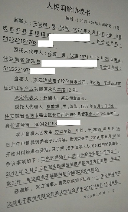 5月16日,患癌员工王光辉的姐夫赶赴浙江乐清,在乐清市城东街道人民调解委员会 主持调解下达成协议,王光辉与浙江达威电子股份有限公司解除合同,仅仅获得一次性对价补偿款12万元。