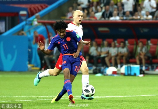 北京时间6月25日,世界杯H组小组赛,哥伦比亚vs波兰,比赛第75分钟,夸德拉多单刀破门。