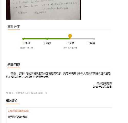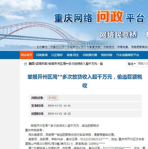 近日,重庆知名企业家向重庆市税务局举报开州区周本玄多次放贷收入超千万元,偷逃巨额税收,昨日在重庆市委办公厅等主办的网络问政平台发布后,开州区税务局当即答复:依法及时进行调查处理。  重庆市税务局: 我叫谢家田,现就周本玄偷逃巨额税收进行实名举报,请贵局查实处理。 谢家田,性别男,年龄56岁,身份证号:5122221962112*****,地址: 重庆市开州区汉丰街道南山中路201号,联系电话: 138961***** 周本玄长期向多人放高利贷,性别男,年龄65岁,身份证号:5122221953041*****,住址:重庆市开州区凤凰城二幢4单元***号,联系电话:156965*****;134362*****; 谢家田向周本玄高利借贷了15次情况 第一笔逃税情况:我从2011年2月28日开始到2015年2月30日止,共向周本玄高利借贷了15次共755万元,从2011年10月19日开始还款或支付利息15次共570.6650万元,这些所得周**没有向贵局申报和缴纳税款吧? 第二笔逃税情况:开州区人民法院(2017)渝0154民初2857号民事判决书显示:2016年12月,周本玄将200万元的谢家田的债权转给李甫能,2015年12月3-2016年12.30利息60万元。这60万元周本玄也没有申报并缴纳税款吧? 第三笔逃税情况:开州区人民法院(2017)渝0154民初3388号民事判决书显示:谢家田偿还周本玄本金884万元,利息从2015年11月起以884万元为基数按年利率24%计算至付清本金之日止。该笔款项我方付给法院1438.8467万元,利息是554.8467万元。 第四笔逃税情况:开州区人民法院(2019)渝02民终885号民事调解书显示:1.谢家田于2019年4月19日前向周本玄支付至2015年9月21日起至2015年12月3日止,以借款本金208万元为基数按月利率2%计算的利息以及至2015年12月4日起至2016年12月6日止以借款本金8万元为基数按月利率2%计算的利息共计120853.34元;2.谢家田于2019年4月19日前向周本玄支付从2015年11月1日起以借款本金25万元为基数,从2015年10月1日起以借款本金83万元为基数、从2015年10月25日起以借款本金200万元为基数、从2017年1月7日起以借款本金8万元为基数均按照年利率24%计算至2018年12月31日止的利息。该调解书已经履行完毕,于今年共向周本玄支付572.3362万元,其中利息是256万余元,周本玄也没有向贵局申报并缴纳税款吧?! 除了本人支付利息其获利1800万元中的偷税,周本玄还有其他人的偷逃利息所得的税款。比如原畜牧局干部万录山向周本玄借款后支付了利息500多万元。周本玄还借给李子清后收了利息300多万元…… 履行纳税义务是每个公民应尽的责任,在此本人特向贵局举办周本玄偷逃税款的违法犯罪行为,敬请贵局查处,并及时反馈给本人相关情况。 举报人:谢家田 联系电话: 138961*****  开州区税务局答复将根据《中华人民共和国税收征收管理法》相关规定,依法及时进行调查处理。