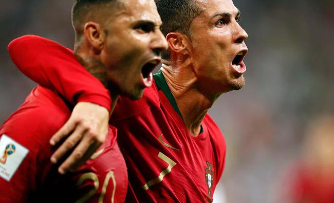 夸雷斯马与C罗庆祝 北京时间6月26日2时(俄罗斯当地时间25日21时),世界杯B组末轮在萨兰斯克开始1场较量,葡萄牙1比1被伊朗逼平,积5分排名小组第二出线。夸雷斯马世界波打进世界杯处子球。下半时,C罗制造点球并主罚却被扑出。补时阶段,安萨里法德点球扳平,葡萄牙因而从小组头名跌至第二。本届世界杯已判20个点球,打破了单届世界杯点球纪录。