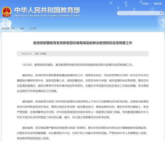 ![]() 原标题:教育部部署教育系统新型冠状病毒感染的肺炎疫情防控应急预案工作 1月23日,教育部再发通知,要求教育系统做好新型冠状病毒感染的肺炎疫情防控应急预案工作。 通知指出,各地和有关高校要高度重视疫情防控工作,采取坚决有力举措,做好疫情防控应急预案。要密切关注疫情发展情况,提前对春季开学有关情况做出科学研判,必要时对学校教学安排及相关工作做出调整。有关高校必须做好开学前疫情防控工作预案。 通知强调,各级教育行政部门和学校在疫情流行期间原则上不举办大型聚集性活动和考试等。近期各地各高校将举行的特殊类型招生考试、高职分类招生考试等一般应推迟进行。确须如期举办的,要在科学研判基础上,制定严格预案,合理调整考试方式等,并向同级疾病预防控制机构和上一级教育行政部门报备。各地要通知辖区内中小学生不参加社会机构等部门举办的比赛、展示、评比等大型聚集性活动和考试等。 通知强调,武汉等疫情严重地区的教育行政部门和高校,要对本地区高校全体师生进行健康宣教和疫情监测,对留校学生发布预警提醒,非必要原因不外出,尤其不到人流量大的场所逗留。严格控制外来人员随意进入校园,取消各种旅游团组进入校园。 (来源:教育部) |