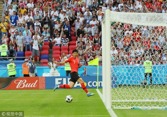 2018年6月27日,俄罗斯喀山,2018俄罗斯世界杯小组赛F组,韩国Vs德国。第96分钟,韩国队孙兴民反击射空门进球。