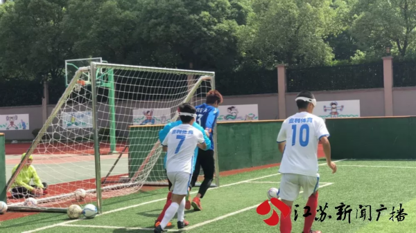 6月23日清晨,在南通特殊教育中心的足球场上,江苏盲人足球队的队员们正在踢一场训练赛,运动员们带着眼罩,一边不断发出声音向其他队员传递自己的方位,同时两腿不断盘带,把球往前踢,身手灵活,对抗程度丝毫不输常人。