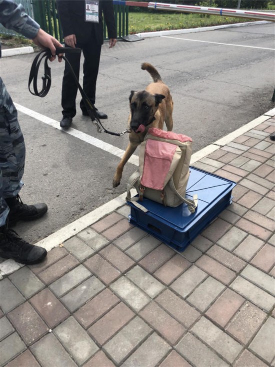 正是因为这里是俄罗斯体育中的重地,所以整个圆湖基地的安检也显得格外特别。在基地门口有一个关于世界杯的证件通行图示,什么样的证件可以进入到这里,也是有明确的规定。门口的安检也显得很特别,所有出入这里的人无论是工作人员还是媒体或者是运动员都要进行严格的安检,而检查并不是通过安检门,而是一条工作警犬。你要把包放在一个安检的箱子上,打开包,安保人员牵着工作犬过来。工作犬都是德国黑背,它们把鼻子伸进包里一通闻,确认安全后还要在门房让保安全部开包在检查一遍才能通行。