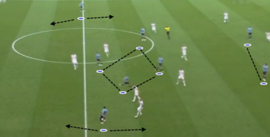这个阵型的好处在于进攻端给予了前锋更多的支持,不过在防守端却也留下隐患。因为防守端球队落位三后腰,他们集中于中路区域,导致两翼空间较大。俄罗斯没有边锋,无法有效利用,但是这个问题对于葡萄牙来说是不存在的。