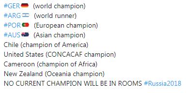 更加残酷的是,新科美洲杯冠军智利、新科中北美金杯赛冠军美国、新科非洲国家杯冠军喀麦隆以及新科大洋洲国家杯冠军新西兰甚至都没有拿到2018俄罗斯世界杯的参赛席位。