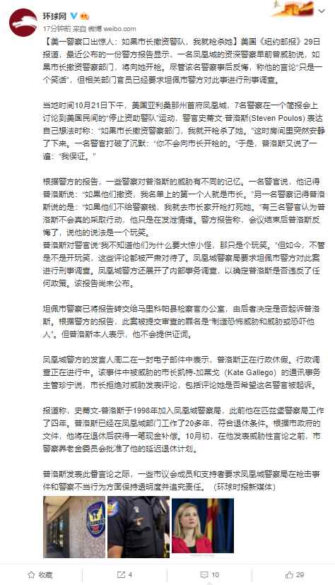 当地时间10月21日下午,美国亚利桑那州首府凤凰城,7名警察在一个简报会上讨论到美国民间的“停止资助警队”运动,警官史蒂文·普洛斯(Steven Poulos) 表达自己想法时称:“如果市长撤资警察部门,我就开枪杀了她。”这时房间里突然安静了下来。一名警官打破了沉默:“你不会向市长开枪的。”于是,普洛斯又说了一遍:“我保证。”