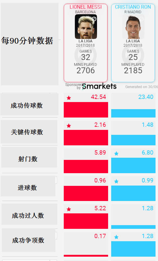 梅西和C罗在本届世界杯中的场均进攻和综合数据,两人竟然有着相同的传球成功率。 从以上数据我们能够看出,梅西和C罗在球队中承担着非常多而重要的责任,这些责任远高于他们在俱乐部中要做的。 本届世界杯两人场均5次的射门数均排名所有球员前列,而在上赛季的五大联赛中,内马尔的场均过人数是五大联赛榜首,但本届世界杯上,梅西告诉全世界他才是最会过人的球员: 他场均6.7次的成功过人比内马尔场均还要多1次。 而C罗呢?在以反击为主的战术打法之下,他也贡献了场均1次的关键传球,并且在球队起高球时充当支点做球——C罗本届世界杯场均贡献了2.3次成功争顶。